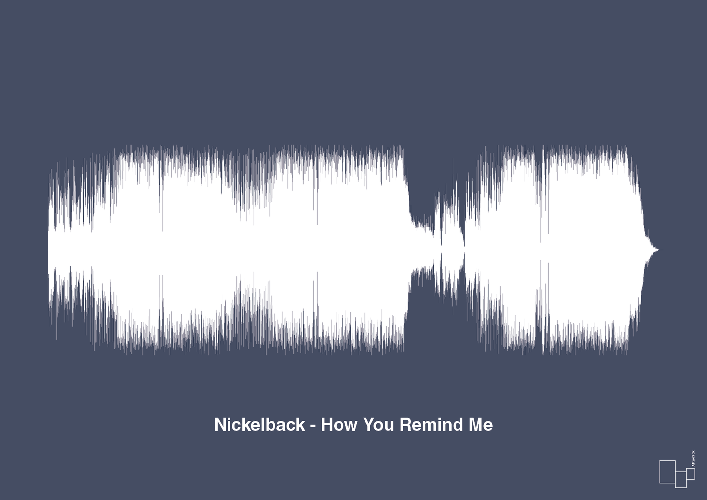 Denne stilrene musikplakat fra A1two3 visualiserer hele lydbølgen fra Nickelbacks rockklassiker “How You Remind Me”. Nummerets energi, dynamik og opbygning bliver oversat til et minimalistisk, grafisk udtryk, hvor sangens rytme og intensitet står som et markant lydbølge-motiv hen over plakaten.