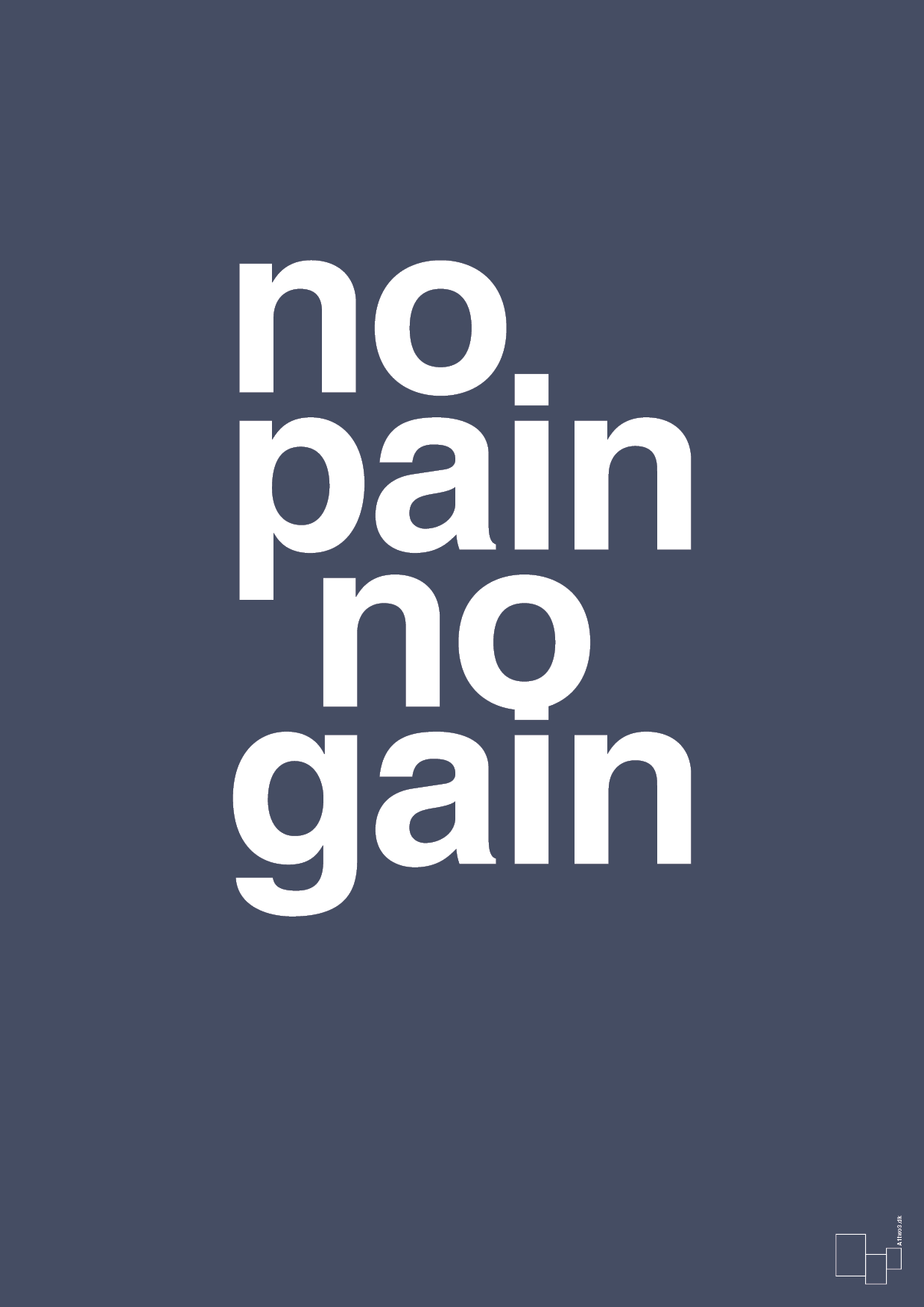 Denne typografiske fitness plakat med teksten “no pain no gain” er skabt til dig, der vil mindes om, hvorfor du presser dig selv lidt ekstra. Det enkle, klare layout og de markante bogstaver sender et tydeligt budskab: fremskridt kræver indsats – uanset om det gælder styrketræning, løb, crossfit, sport eller personlig udvikling.