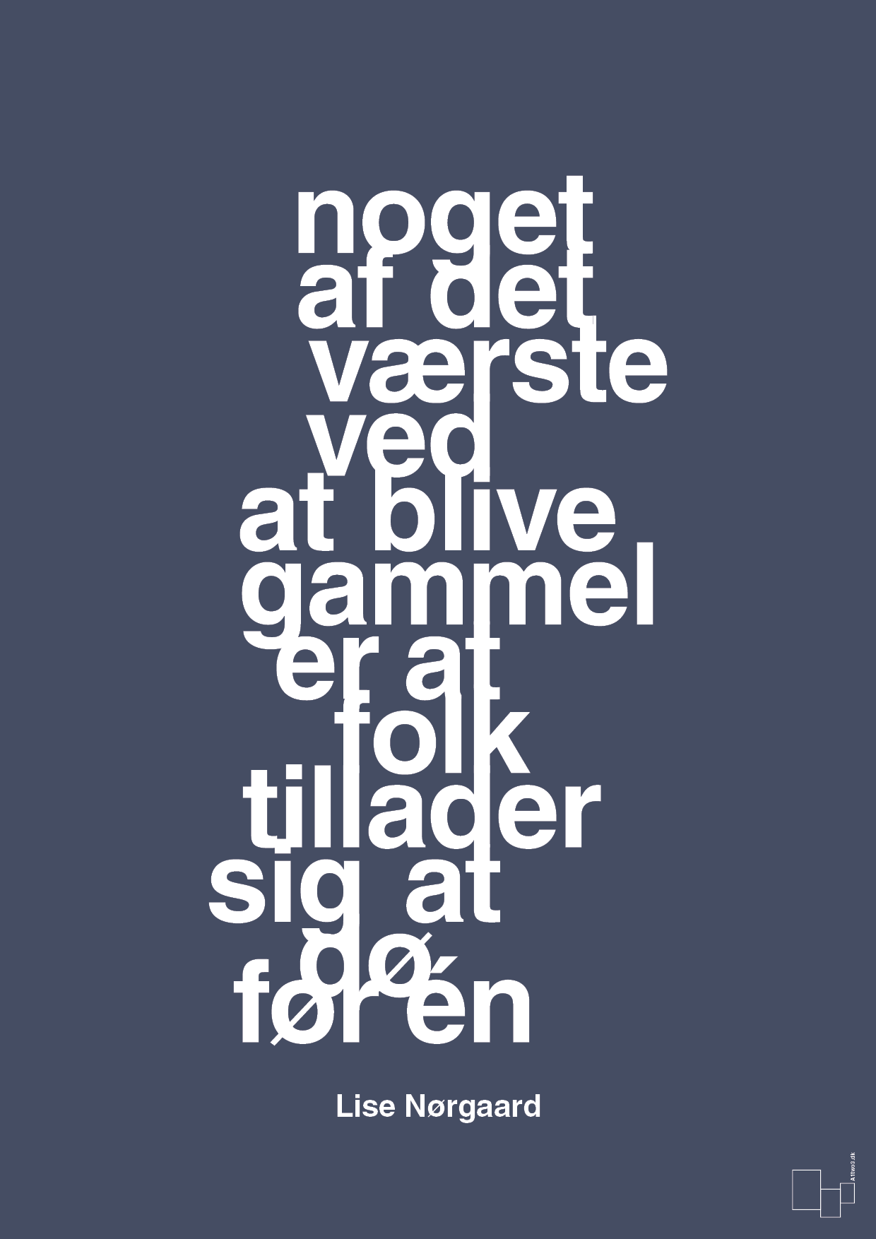Denne citatplakat med de ikoniske ord af Lise Nørgaard rammer lige midt i den tørre, varme danske humor: En skarp refleksion over det at blive ældre, pakket ind i selvironi, livsmod og en snert melankoli. Plakaten er skabt som et moderne statement-piece, der både får gæsterne til at smile og stoppe op et øjeblik.