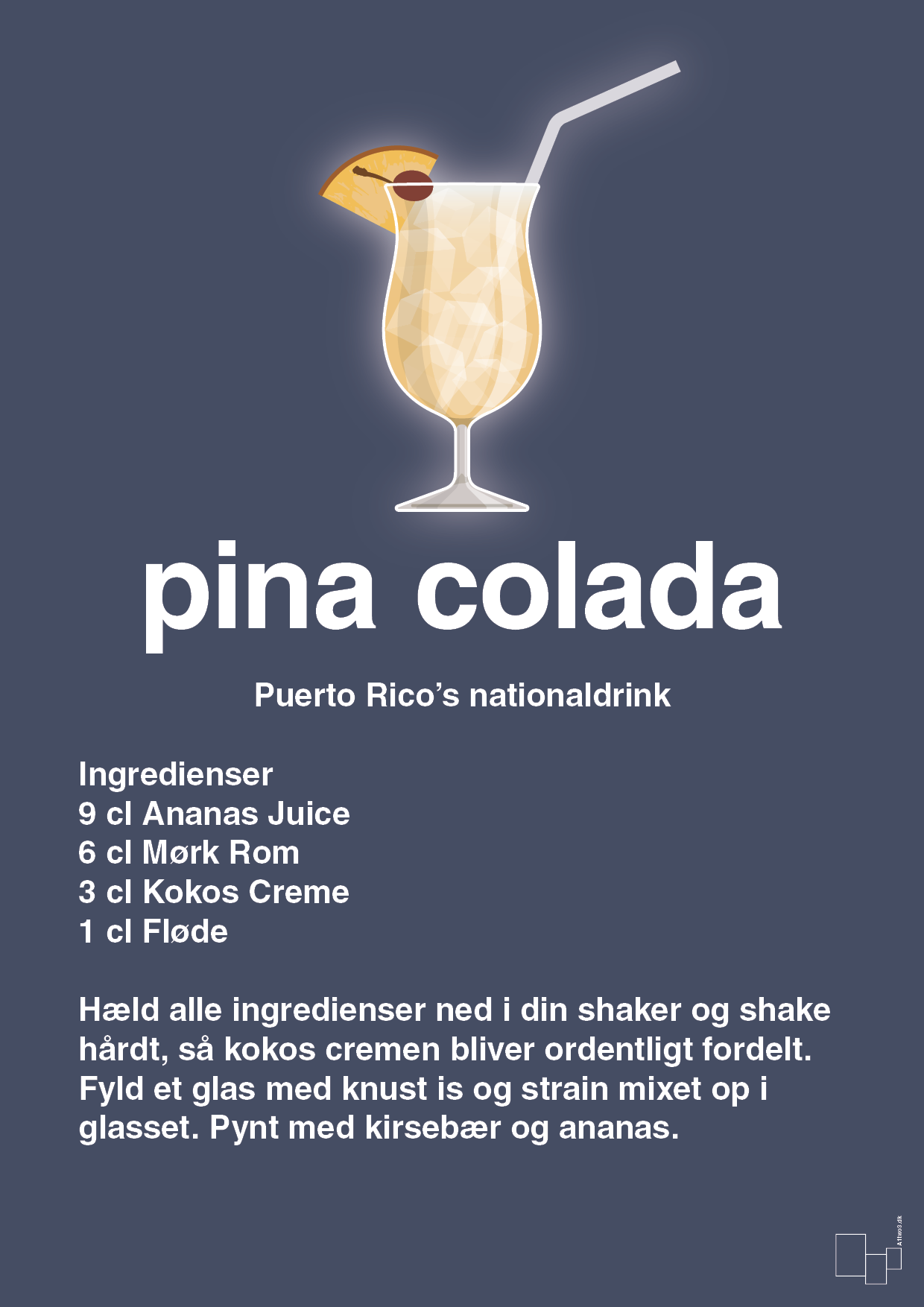Typografien er i fokus, så opskriften står knivskarpt og letlæselig: præcise mål på ananasjuice, mørk rom, kokoscreme og fløde, samt en enkel trin-for-trin vejledning. Det gør plakaten både dekorativ og funktionel – lige til at følge, når du mikser dine egne drinks.