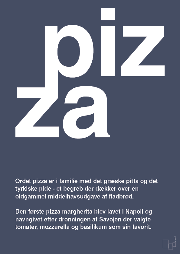 Det store typografiske motiv skaber en tydelig, grafisk effekt, mens den korte tekst forneden inviterer til samtale, hver gang der bages, bestilles eller deles pizza. En moderne madplakat, der både fungerer alene og i en billedvæg sammen med andre køkkenplakater.