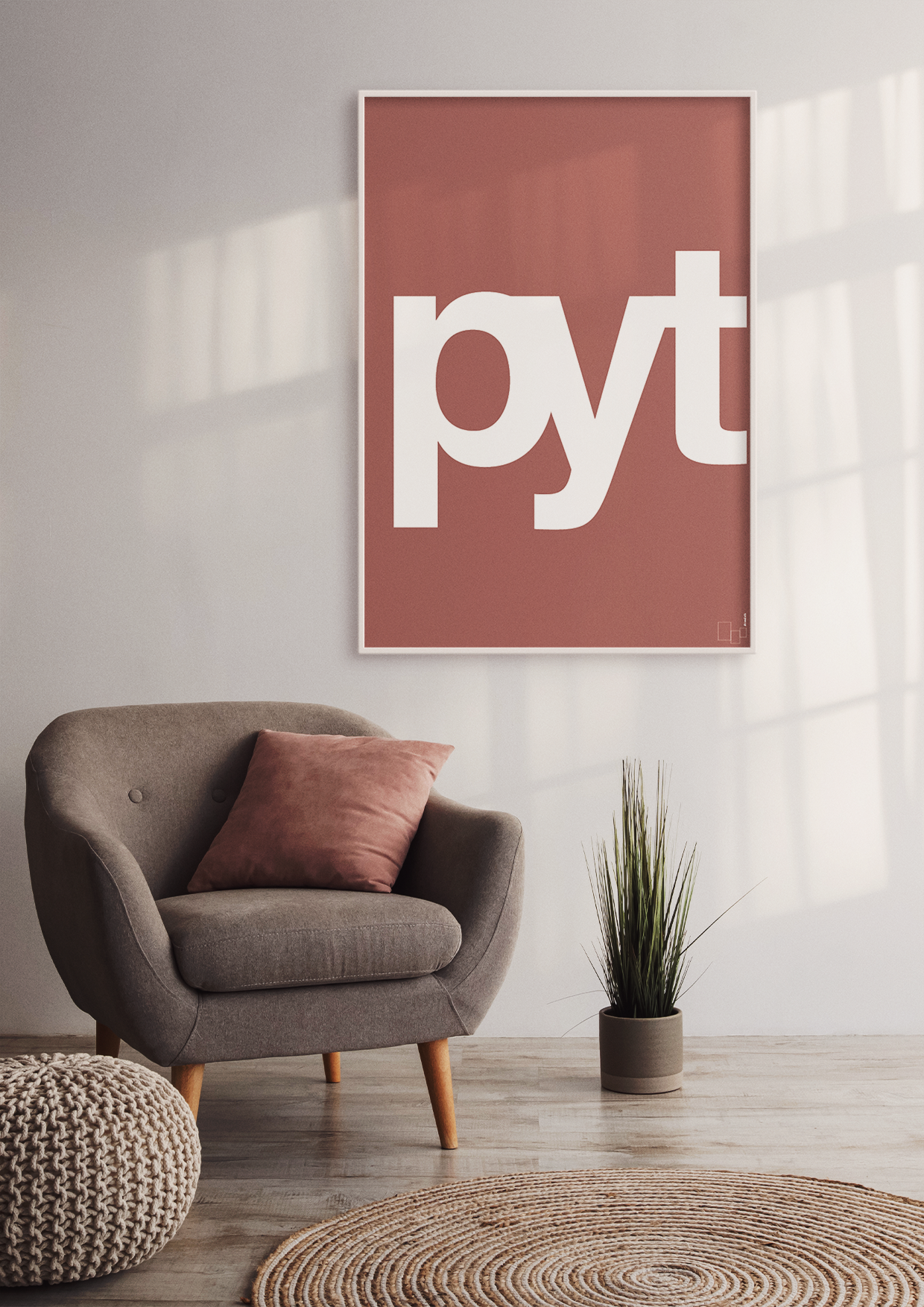 Designet er eksklusivt udviklet af A1two3 i et moderne, skandinavisk formsprog med fokus på typografi og klare kontraster. Plakaten trykkes i Danmark på kvalitets kunstpapir i høj opløsning, så både farver og detaljer står knivskarpt. Du kan vælge mellem 25 forskellige farver og mindst 13 forskellige størrelser, så din pyt plakat passer perfekt til både rummets stil og din billedvæg.