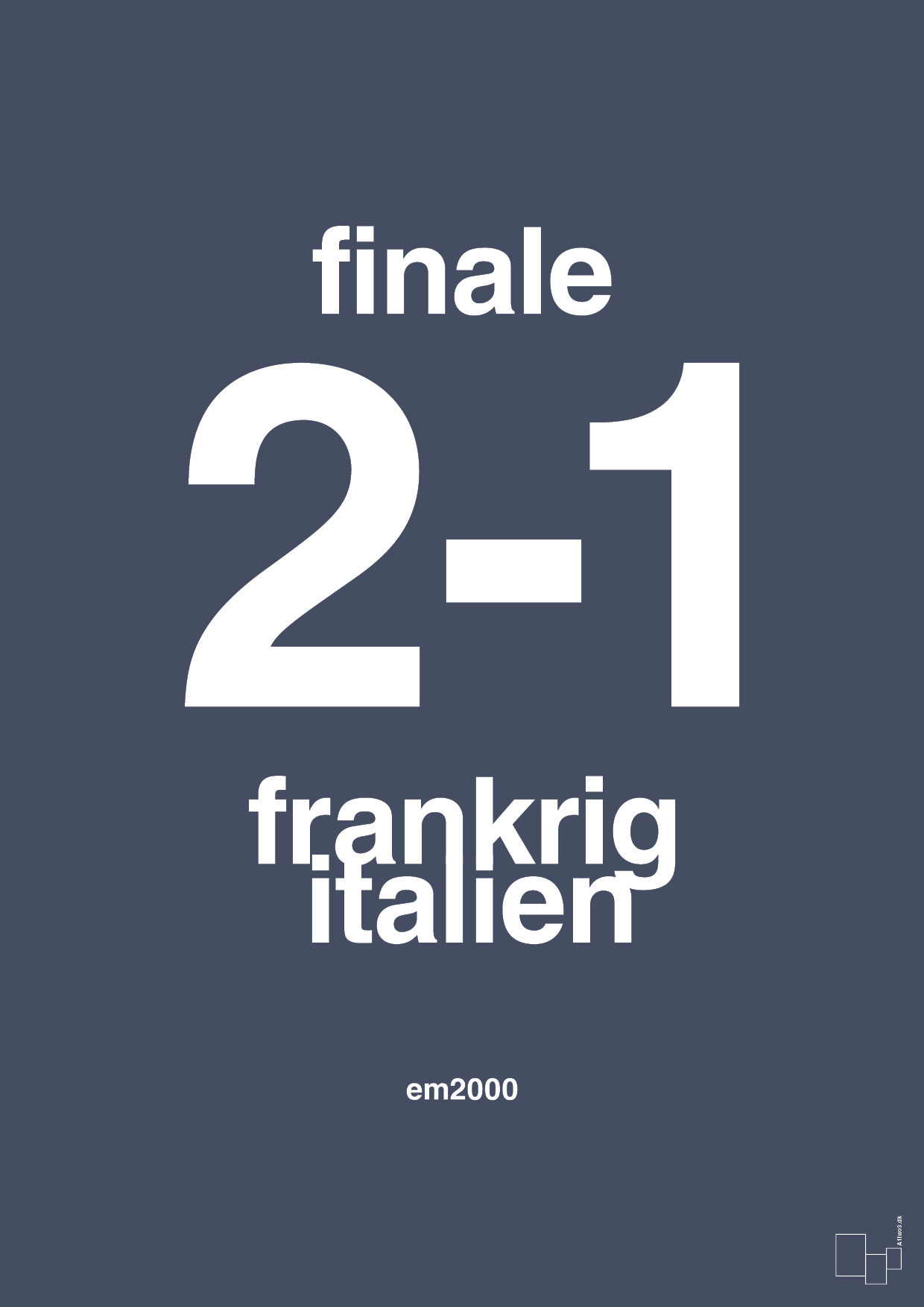 Her får du en stilren fodbold plakat, der hylder EM finalen i år 2000, hvor Frankrig sikrede sig titlen med en 2-1 sejr over Italien. Resultatet står stort, tydeligt og grafisk midt på plakaten, flankeret af landenes navne i et skarpt, typografisk udtryk. En nedtonet reference til “em2000” fuldender det minimalistiske design.