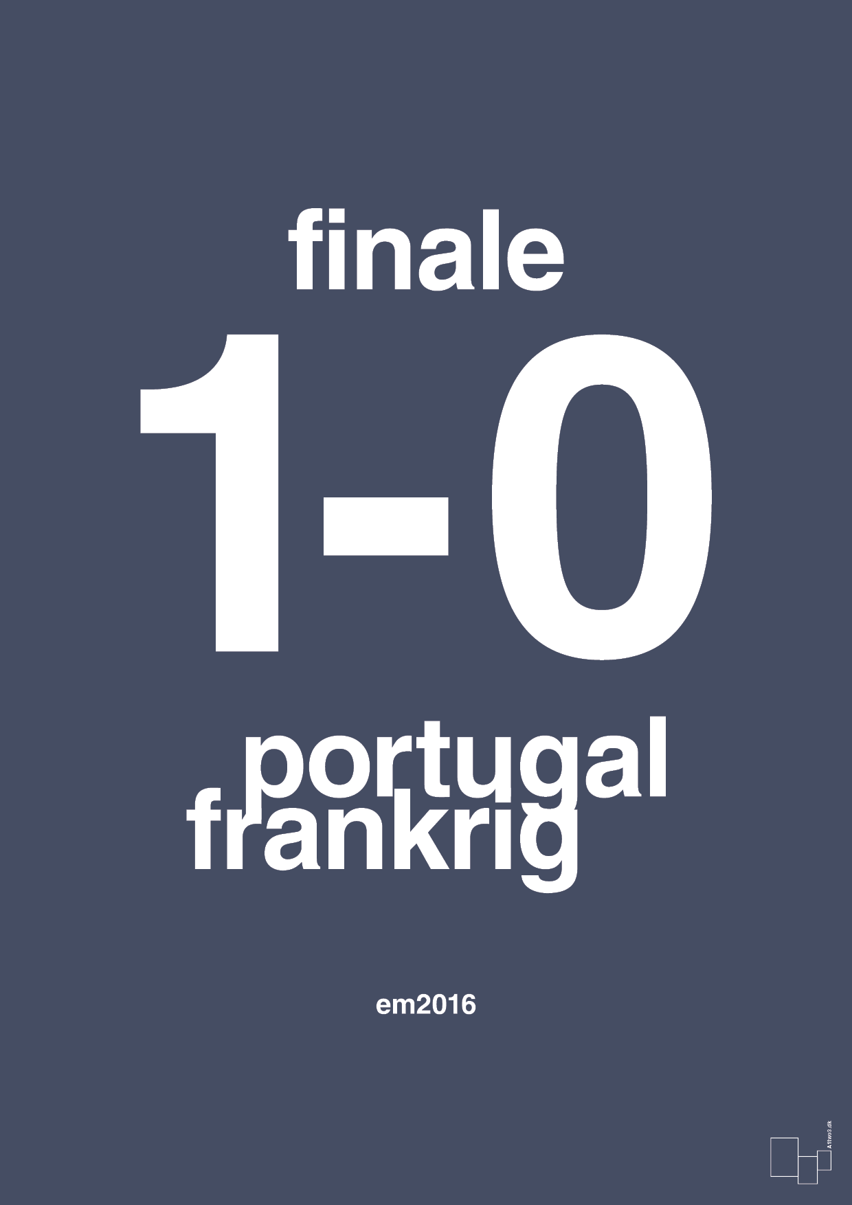 Denne fodbold plakat fanger øjeblikket, hvor Portugal slog Frankrig 1-0 i EM finalen 2016 – reduceret til et ikonisk, grafisk statement. Det store, dominerende slutresultat står i centrum, flankeret af de to landenavne og den enkle reference til “em2016” nederst. En plakat, der minder dig om en af de mest dramatiske fodboldfinaler i nyere tid – uden støj, kun det afgørende tal.