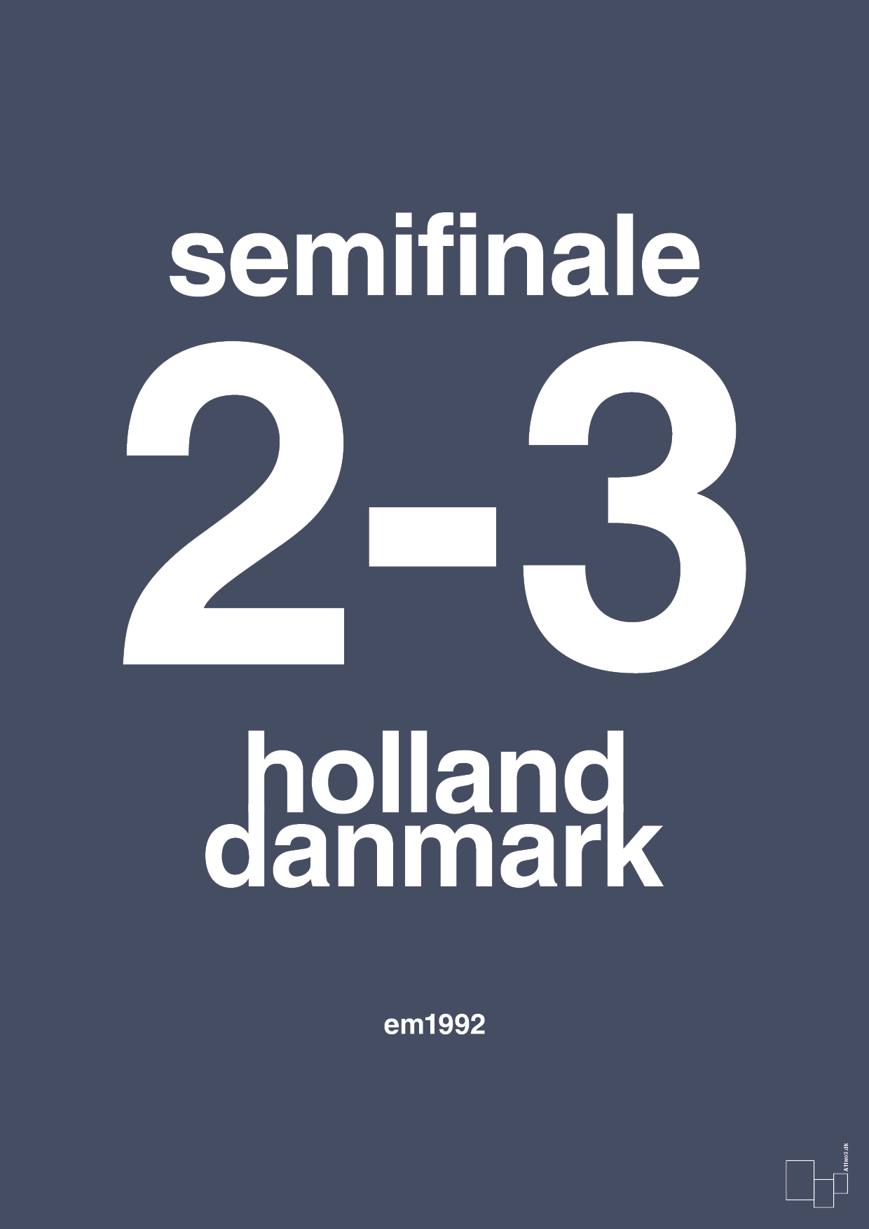Denne grafiske fodboldplakat hylder den legendariske EM-semifinale i 1992, hvor Danmark sensationelt slog Holland 3-2 og banede vejen til den historiske EM-triumf. Resultatet står stort og markant i centrum, mens holdnavne og årstal er sat op i et stramt, moderne typografisk layout, der giver plakaten et stilrent og tidløst udtryk.