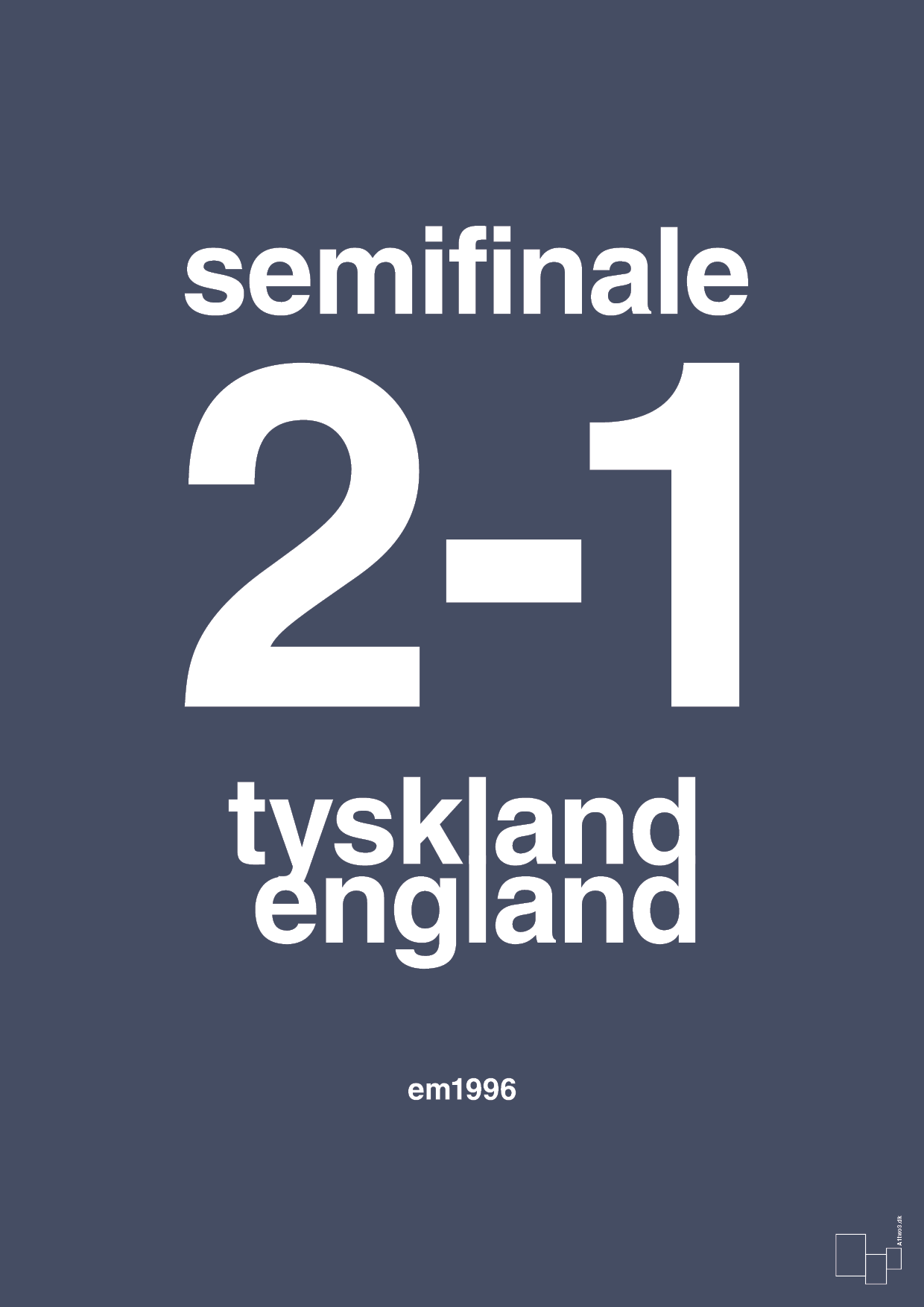 Denne plakat hylder den dramatiske EM-semifinale i 1996, hvor Tyskland slog England 2-1 – fortolket som et rent, grafisk statement. Resultatet står i centrum med store, markante tal og et stramt typografisk layout, der gør kampen til et tidløst designobjekt frem for blot et sportsligt minde.