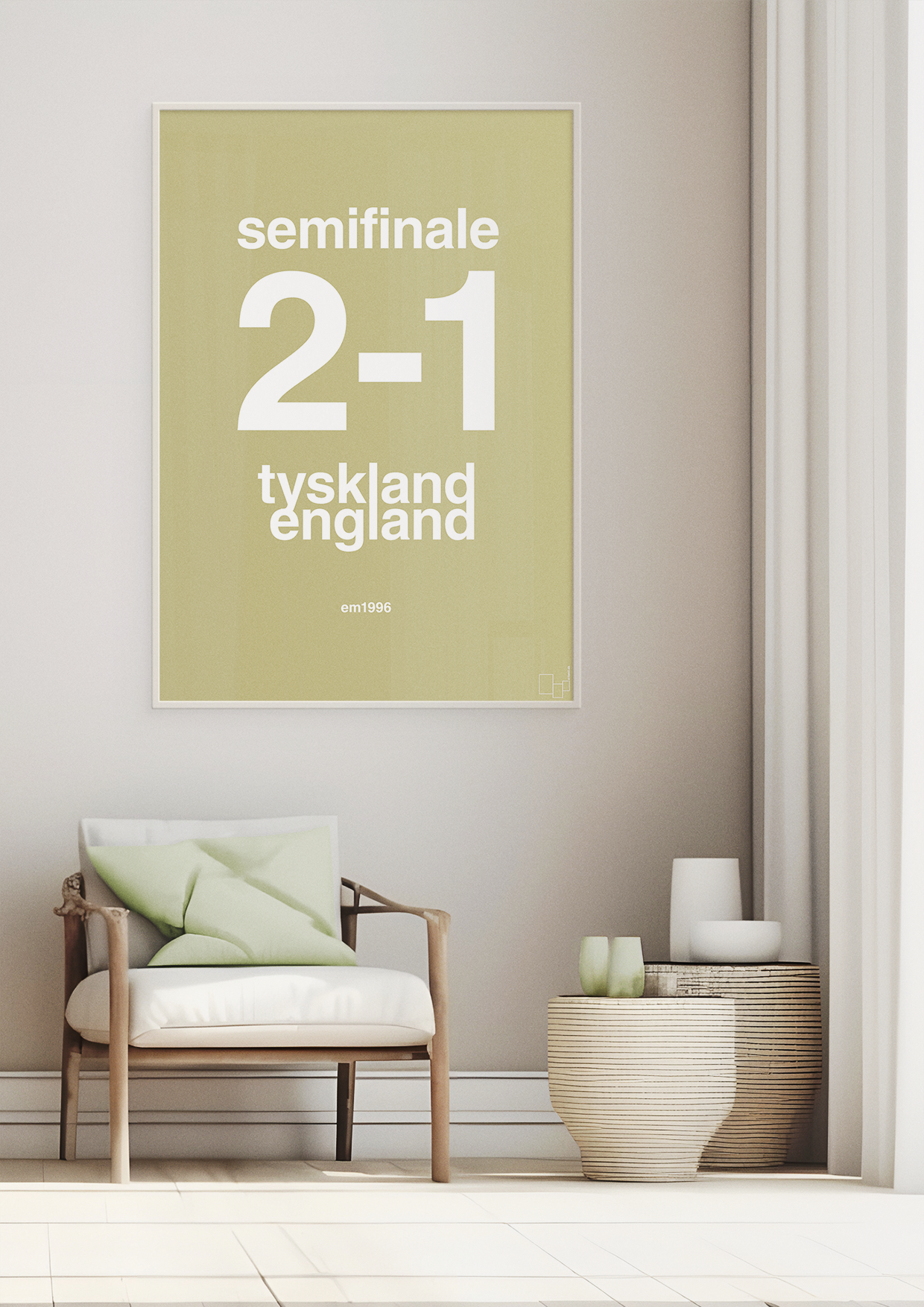 Plakaten er perfekt til dig, der elsker fodbold, historiske EM-kampe og minimalistisk design. Den fungerer både som sportsplakat og stilren vægdekoration, der giver kant til indretningen uden at tage over. Hæng den i stuen, kontoret, gamer-værelset eller i den dedikerede fodbold-hule – alene eller som del af en billedvæg med andre kampresultater.