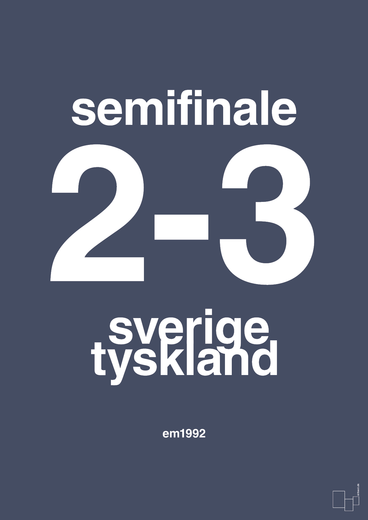 Denne plakat fra A1two3 hylder den legendariske EM-semifinale i 1992, hvor Sverige og Tyskland mødtes i en dramatisk kamp, der endte 2-3. Resultatet står skarpt og dominerende i et typografisk design, der gør kampen til et stilrent kunstværk til væggen.