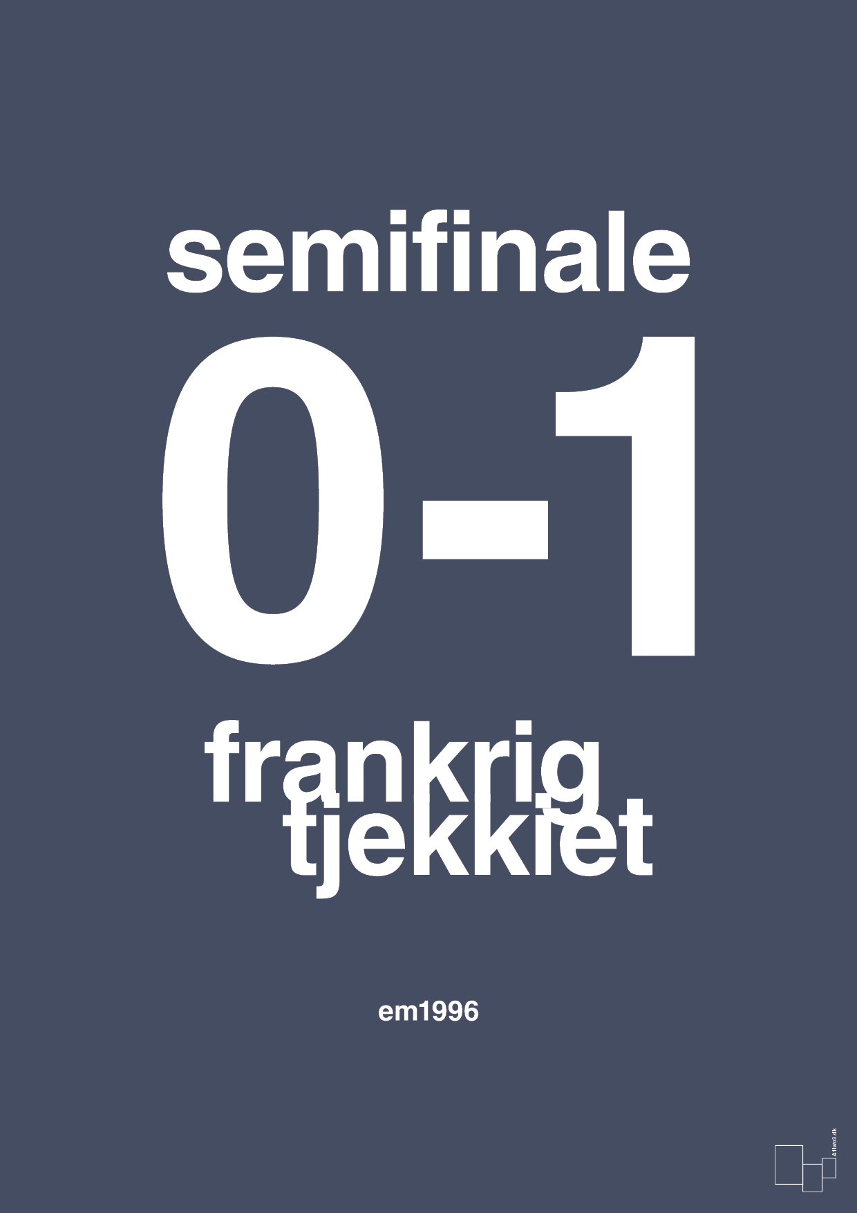 Denne grafiske fodboldplakat fortolker en af de mest mindeværdige kampe fra EM 1996: semifinalen mellem Frankrig og Tjekkiet, der endte 0-1. Resultatet står med store, tydelige tal i centrum, mens holdnavne og årstal er sat ind i et stramt, typografisk layout. En enkel, men markant sport plakat, der lader tallet fortælle historien.