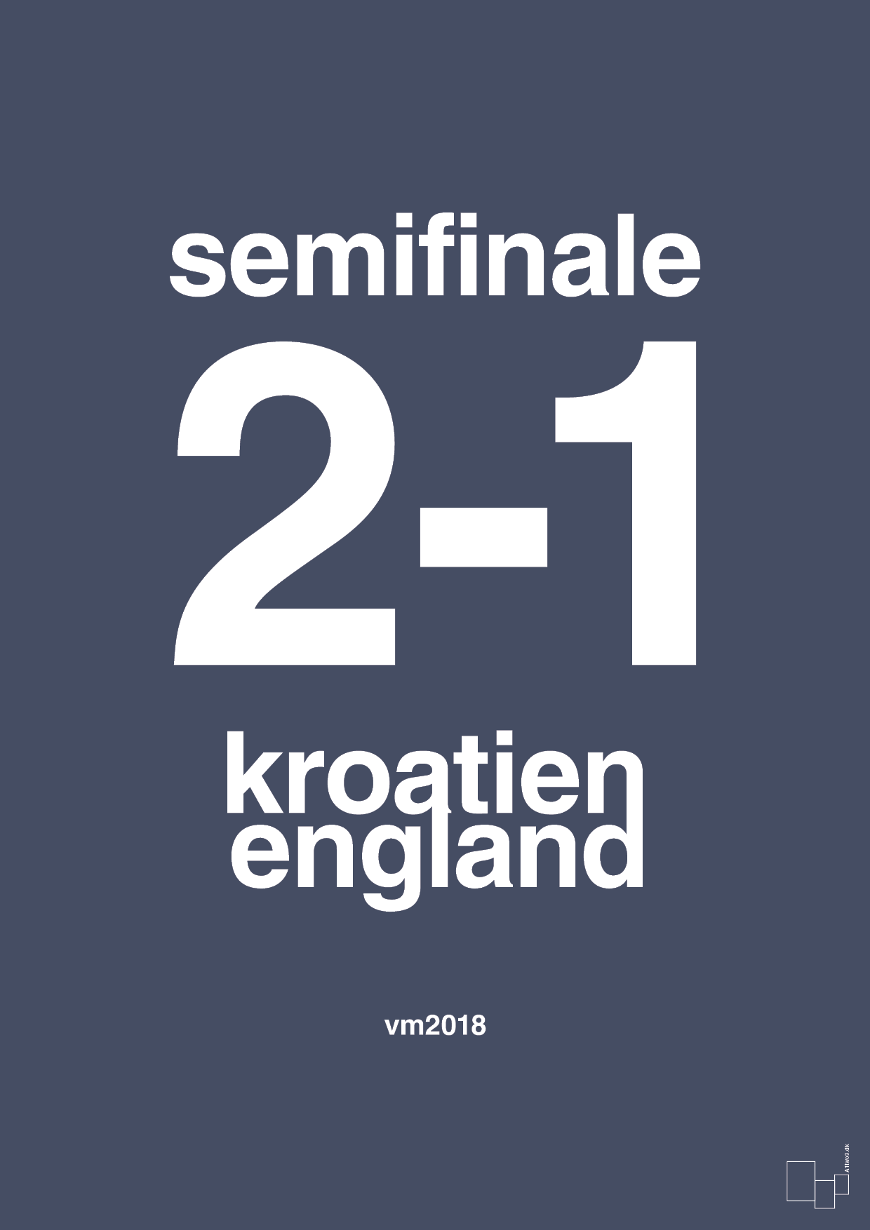 Denne grafiske fodbold plakat fanger øjeblikket, hvor Kroatien slog England 2-1 i VM 2018 semifinalen – reduceret til ren typografi og stærk, skandinavisk minimalisme. Resultatet står markant i centrum, så kampen bliver et stilrent statement på væggen frem for et traditionelt fodboldbillede.