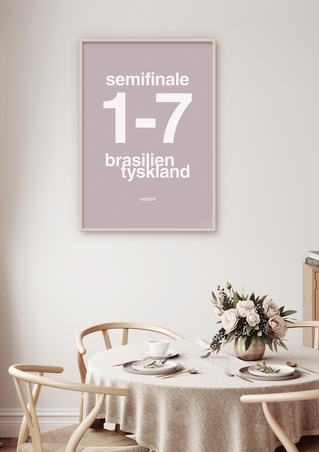 Designet er rent og skandinavisk med fokus på tal, typografi og stærk komposition. Den store resultatangivelse “1–7” er centrum for plakaten, mens holdnavne og årstal diskret understreger kampens betydning. Det gør plakaten både tidløs og grafisk skarp – oplagt til en billedvæg med andre sportsplakater eller som enkeltstående statement piece.