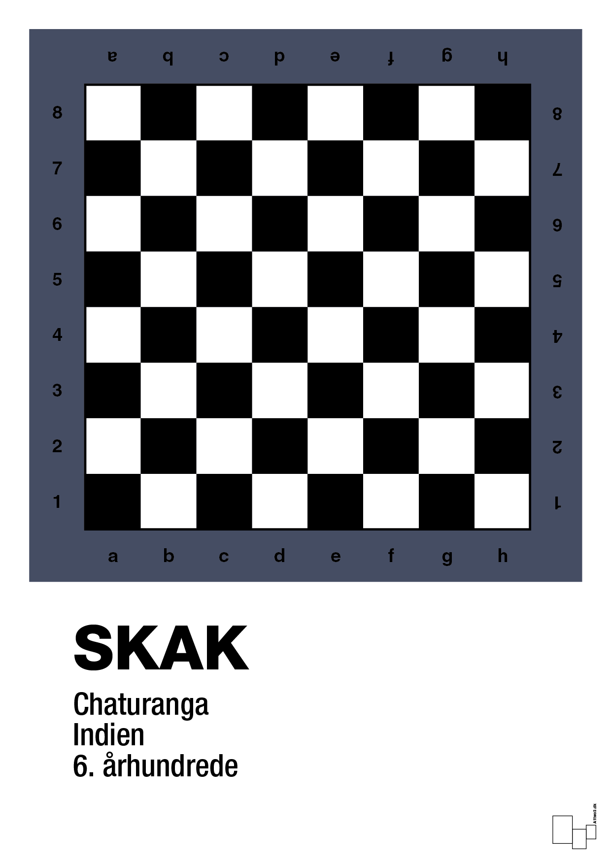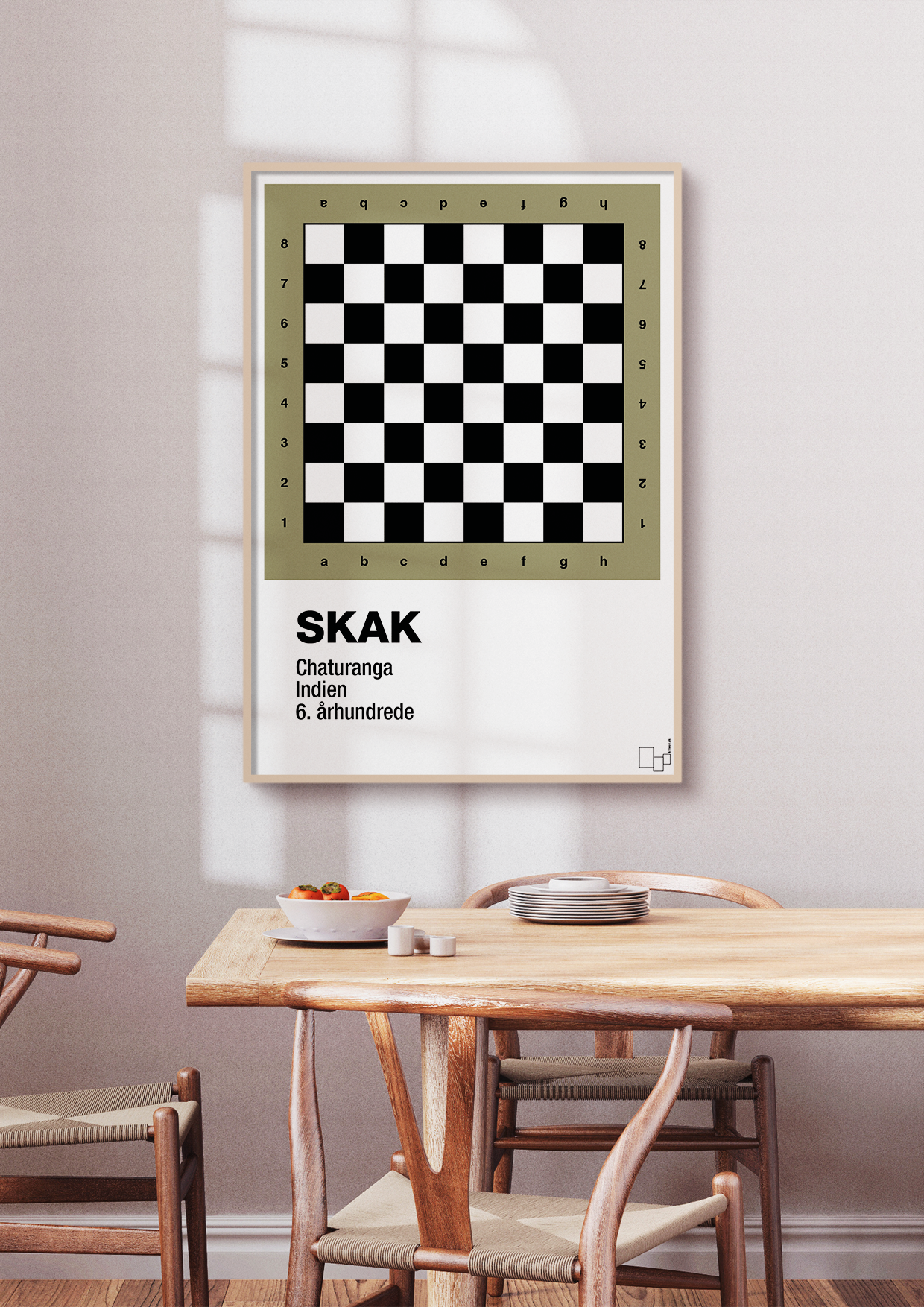 Denne skak plakat fra A1two3 forvandler det klassiske skakbræt til et stilrent, moderne kunstværk. Den ikoniske 8x8 spilleplade med sort-hvide felter er sat op med koordinater langs kanten og en tydelig reference til spillets oprindelse: “Skak – Chaturanga, Indien, 6. århundrede”. Resultatet er en grafisk stærk skak plakat, der både hylder spillet og skandinavisk minimalisme.