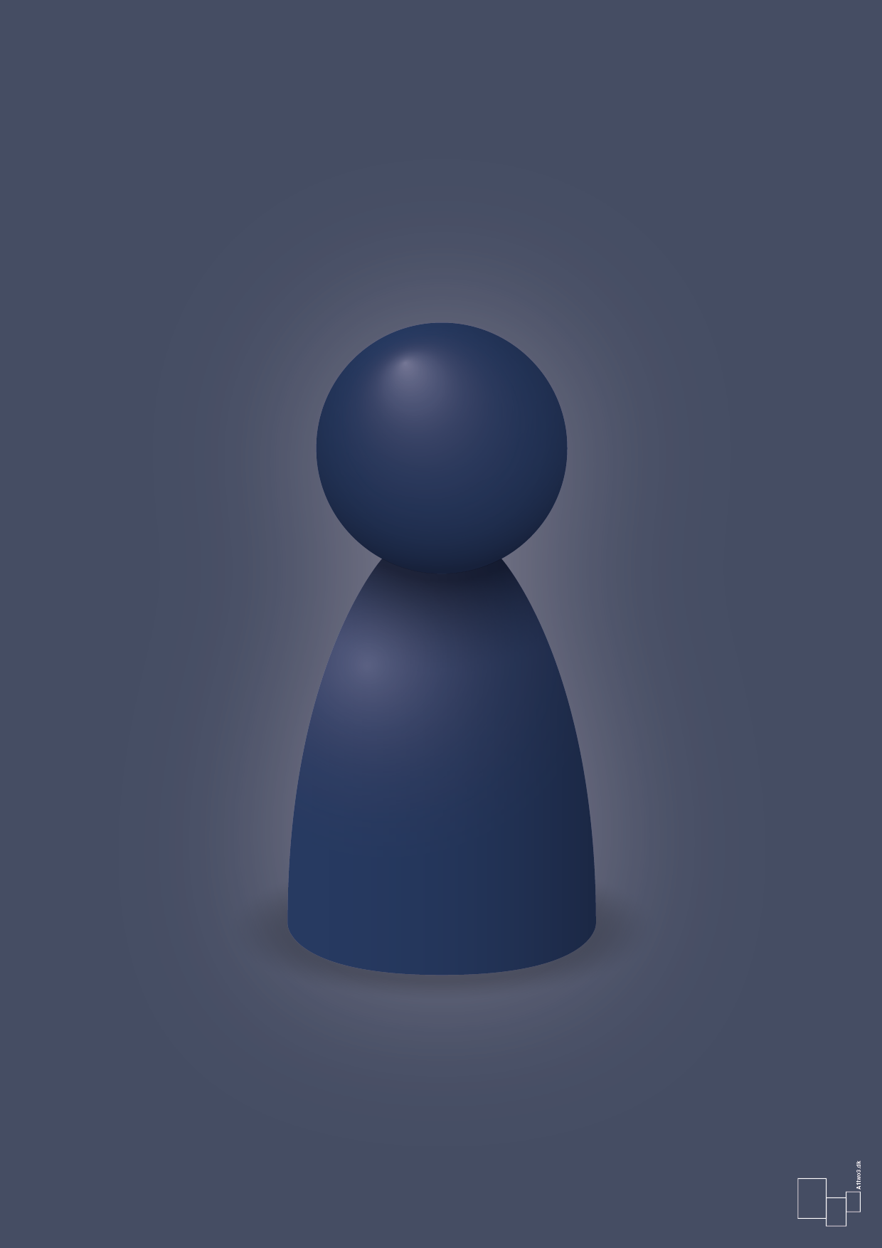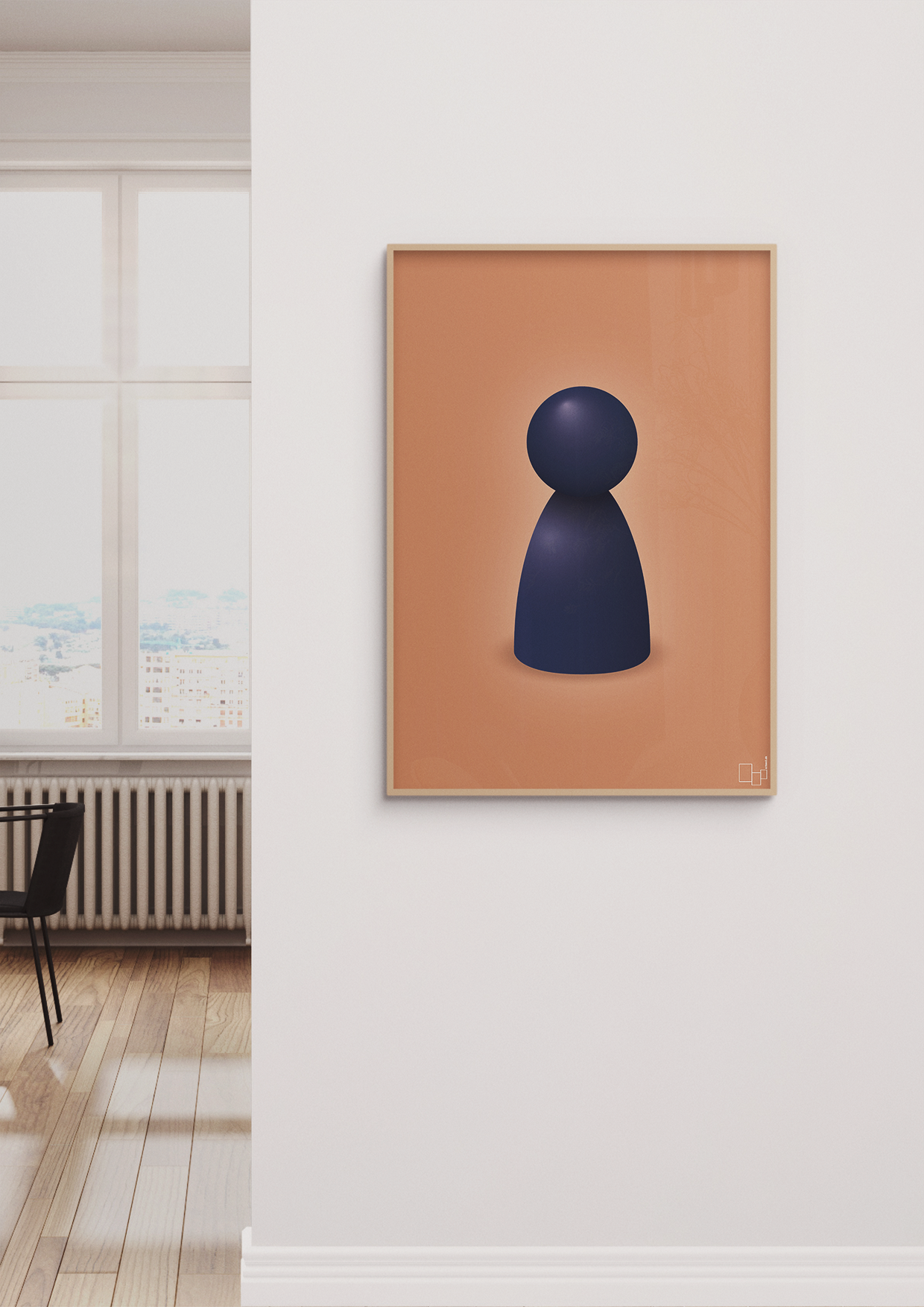 Denne plakat med en ikonisk spillebrik fortolker den klassiske brik fra brætspillets verden i et stilrent, skandinavisk design. Den enkle figur står alene i billedet, modelleret med bløde lysreflekser og skygge, så den næsten træder ud af plakaten og skaber et roligt, grafisk fokuspunkt på væggen.