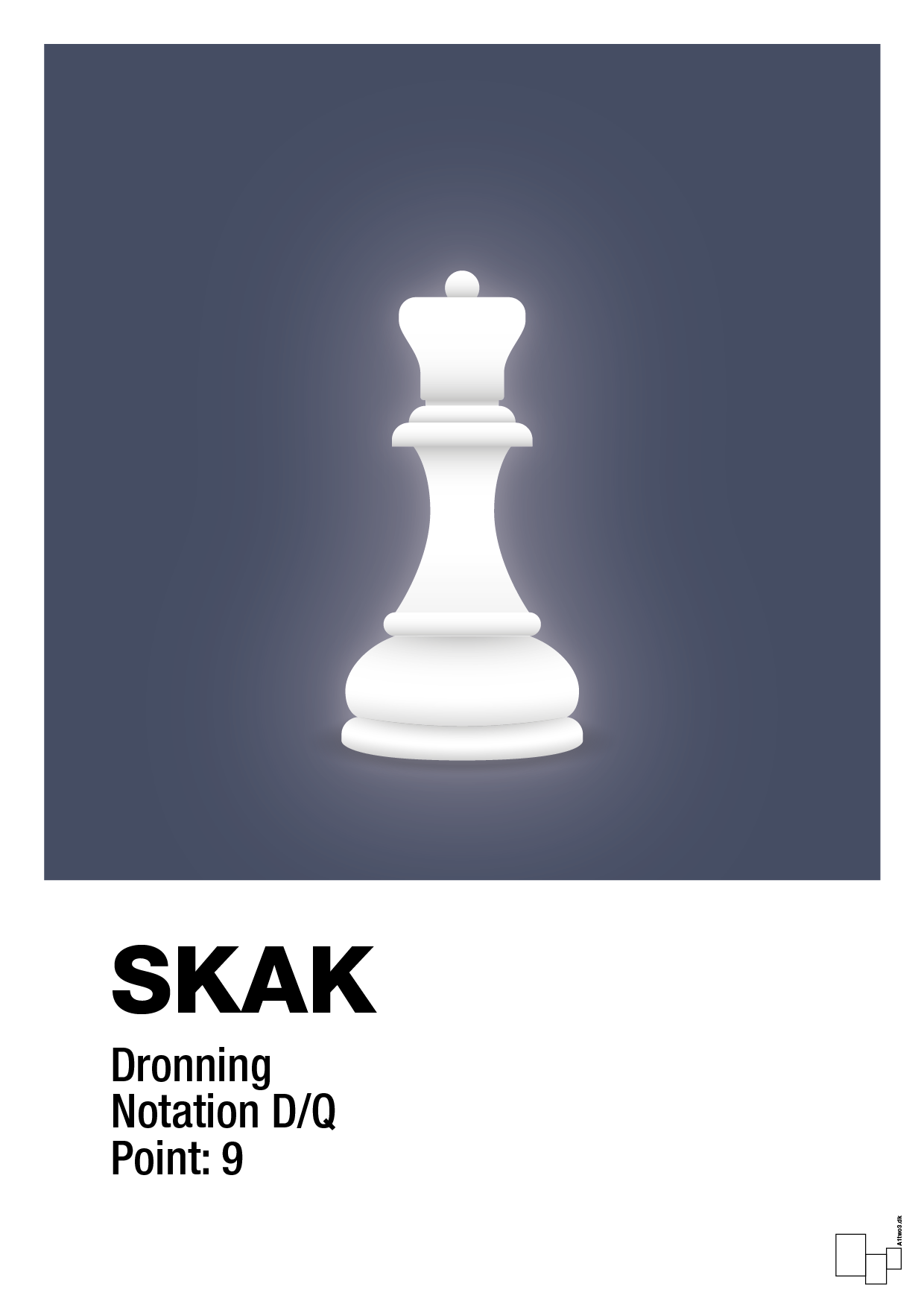 Dronningen er brættets stærkeste brik – og på denne skak plakat får hun hovedrollen. Den hvide spillebrik står skarpt og minimalistisk i centrum, omgivet af en diskret glød, der fremhæver dens kraft og elegance. Nederst finder du enkel typografi med ordet “SKAK”, brikkens navn, notation og pointværdi, som giver plakaten et rent, næsten infografisk udtryk.