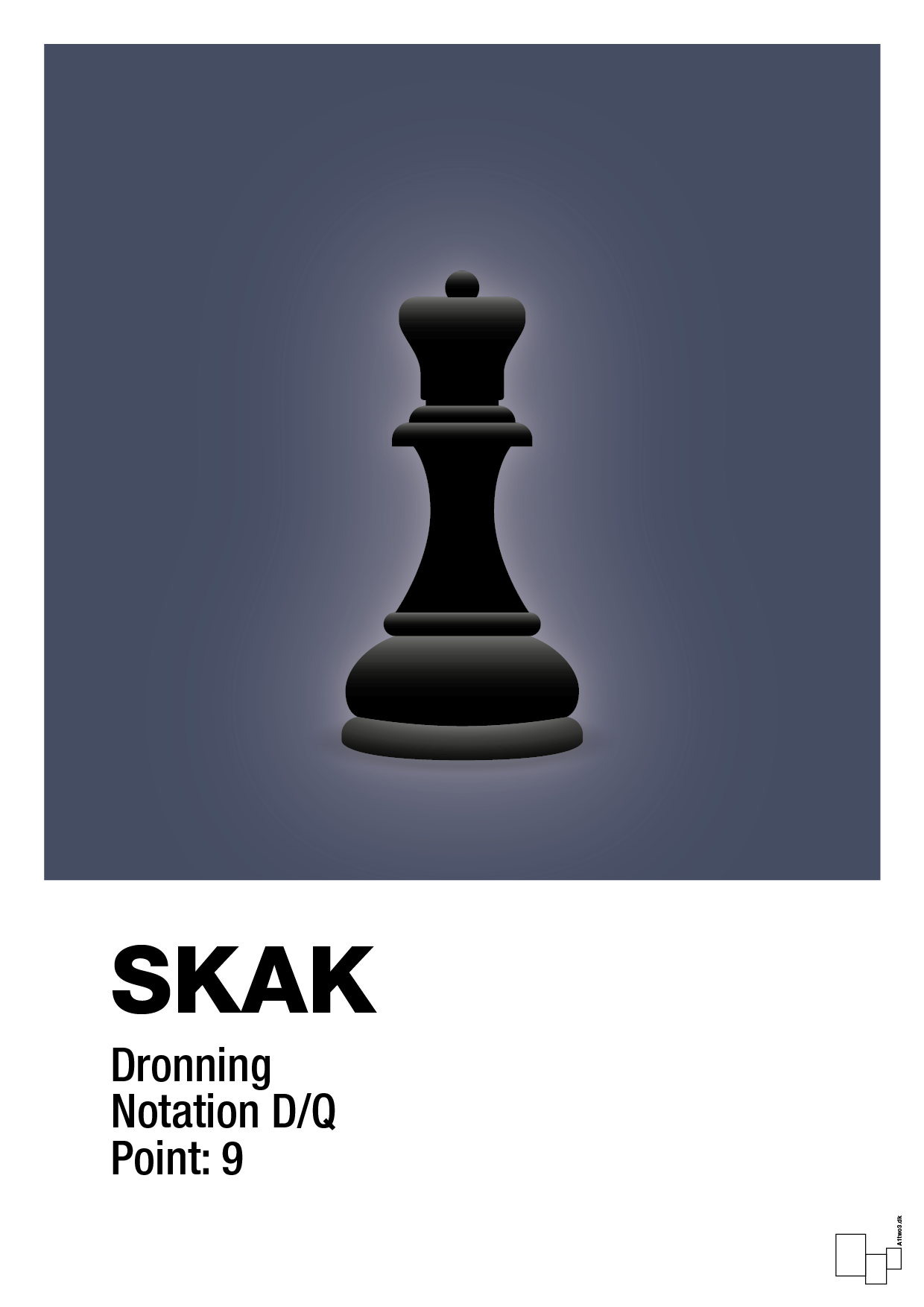 Plakaten kombinerer enkel, skandinavisk typografi med et ikonisk motiv: den klassiske skakdronning. Under motivet finder du tydelig tekst med “SKAK”, brikkens navn, notation (D/Q) og points. Det giver et grafisk, næsten infografisk udtryk, som gør plakaten oplagt til både skakentusiasten og den designbevidste boligindretter, der ønsker et motiv med kant og personlighed.
