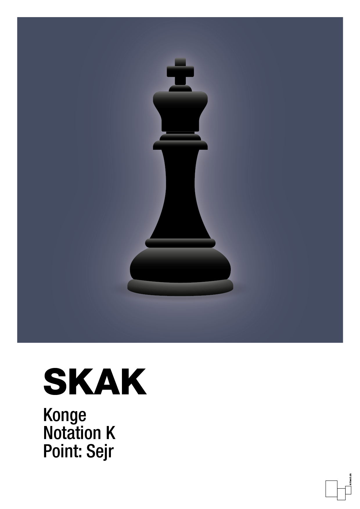 Denne skak plakat sætter spillets vigtigste brik i centrum: kongen. Den ikoniske silhuet står klart og markant i et minimalistisk, grafisk univers, der kombinerer skarp typografi, simple former og et stilrent, nordisk udtryk. Nederst på plakaten finder du teksten “SKAK” samt en kort, informativ beskrivelse af brikken – konge, notation og point – hvilket giver plakaten et næsten poster-agtigt, museumslignende look.