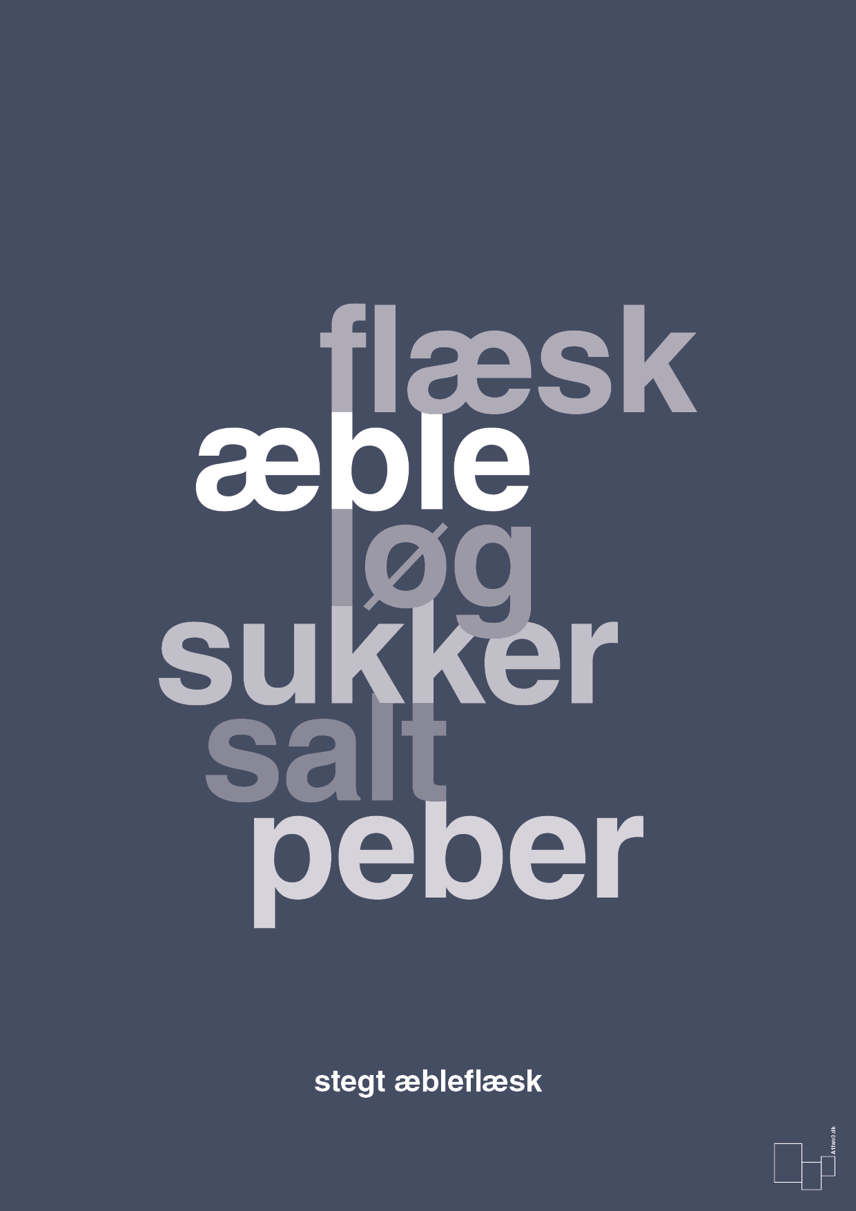 Denne typografiske madplakat hylder en af de mest elskede danske klassikere: stegt flæsk med det hele. Med en stram, grafisk opbygning er ingredienserne sat op som et visuelt recept-kodeord: flæsk, æble, løg, sukker, salt og peber står oven på hinanden i et markant og legende layout. Resultatet er en moderne køkkenplakat, der både er humoristisk og stilren.