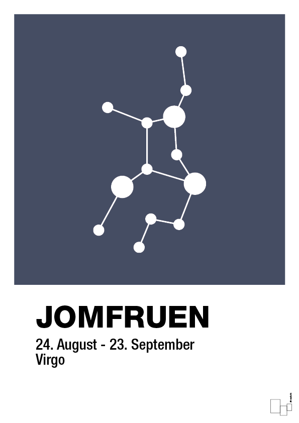 Plakaten viser jomfruens stjernebillede i en ren, ikonisk form, understøttet af tydelig typografi med navn, datoer (24. august – 23. september) og den engelske betegnelse “Virgo”. Det gør motivet både dekorativt og informativt – ideelt som personlig horoskop plakat til fødselsdagsgave, dåbsgave, konfirmation eller som en lille hilsen til en særlig jomfru i dit liv.