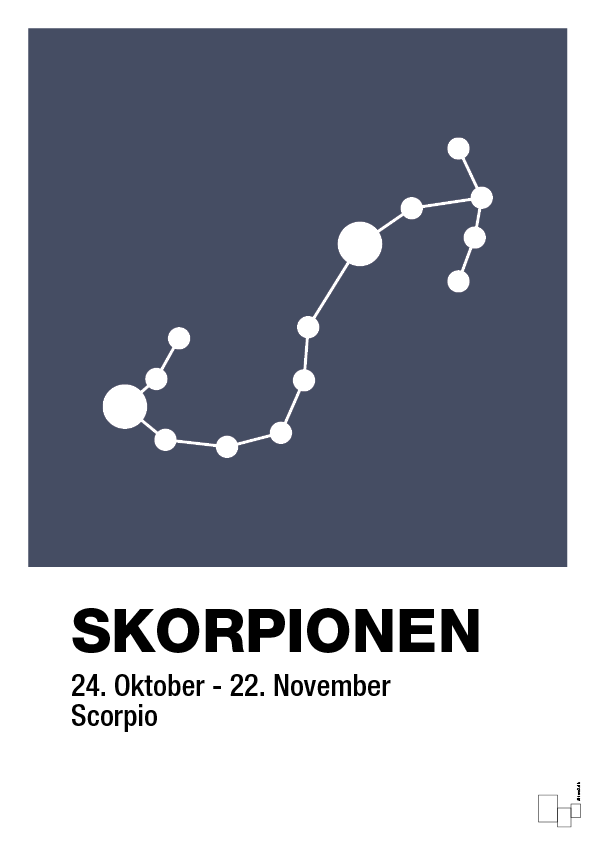 Stjernebilledet af skorpionen er tegnet op som en stiliseret, sammenhængende række cirkler, der danner den karakteristiske form på nattehimlen. Under motivet står “Skorpionen”, datoerne 24. oktober – 22. november samt den engelske betegnelse “Scorpio”, så plakaten både fungerer dekorativt og informativt – perfekt til den, der identificerer sig stærkt med sit stjernetegn.