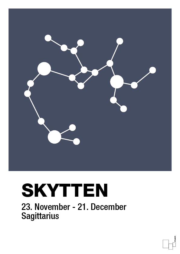 Denne stilrene stjernebillede-plakat fortolker stjernetegnet skytten i et enkelt, grafisk univers. De klare cirkler og linjer danner skyttens karakteristiske stjernebillede, mens den skarpe typografi nederst tydeligt fremhæver “Skytten”, datoerne 23. november – 21. december og den engelske betegnelse “Sagittarius”. Resultatet er en moderne horoskop plakat, der kombinerer astrologi med dansk designæstetik.