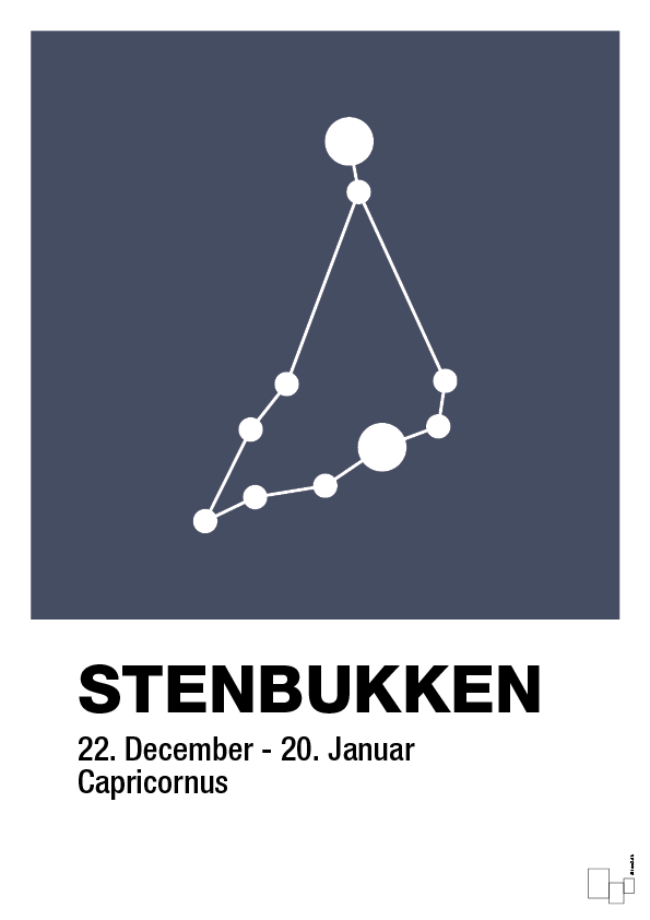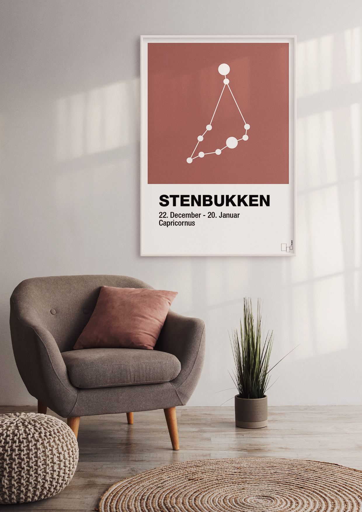 Stjernebillede stenbukken er eksklusivt designet til A1two3 i et typografisk, nordisk formsprog med fokus på balance, kontrast og roligt overblik. Plakaten trykkes i Danmark på kraftigt kvalitetspapir i kunstplakat-standard, så både farver og detaljer står skarpt år efter år.