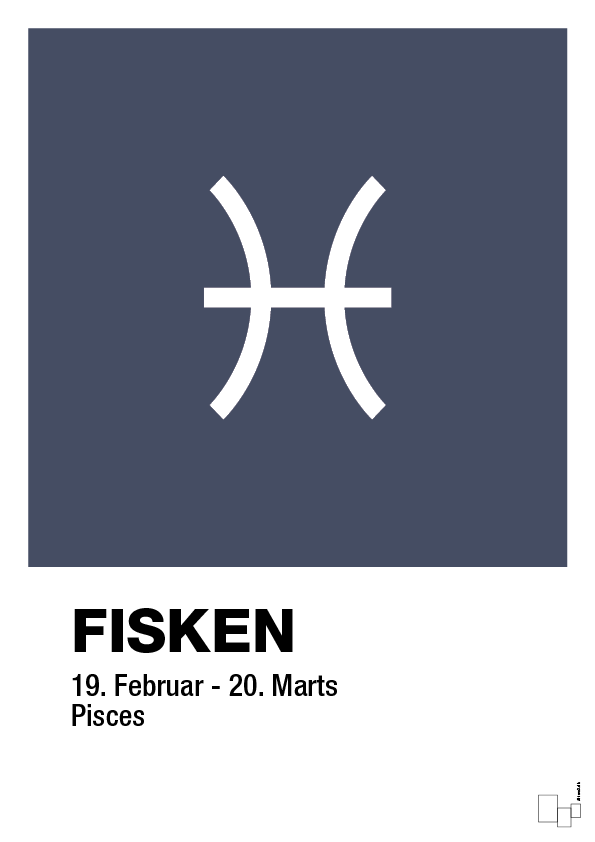 Fisken er kendt som det følsomme, kreative og empatiske stjernetegn – og netop den energi afspejles i plakatens enkle, balancerede udtryk. Den typografiske base med teksten “FISKEN – 19. februar – 20. marts – Pisces” giver et tydeligt, grafisk fokus, som gør plakaten oplagt som: