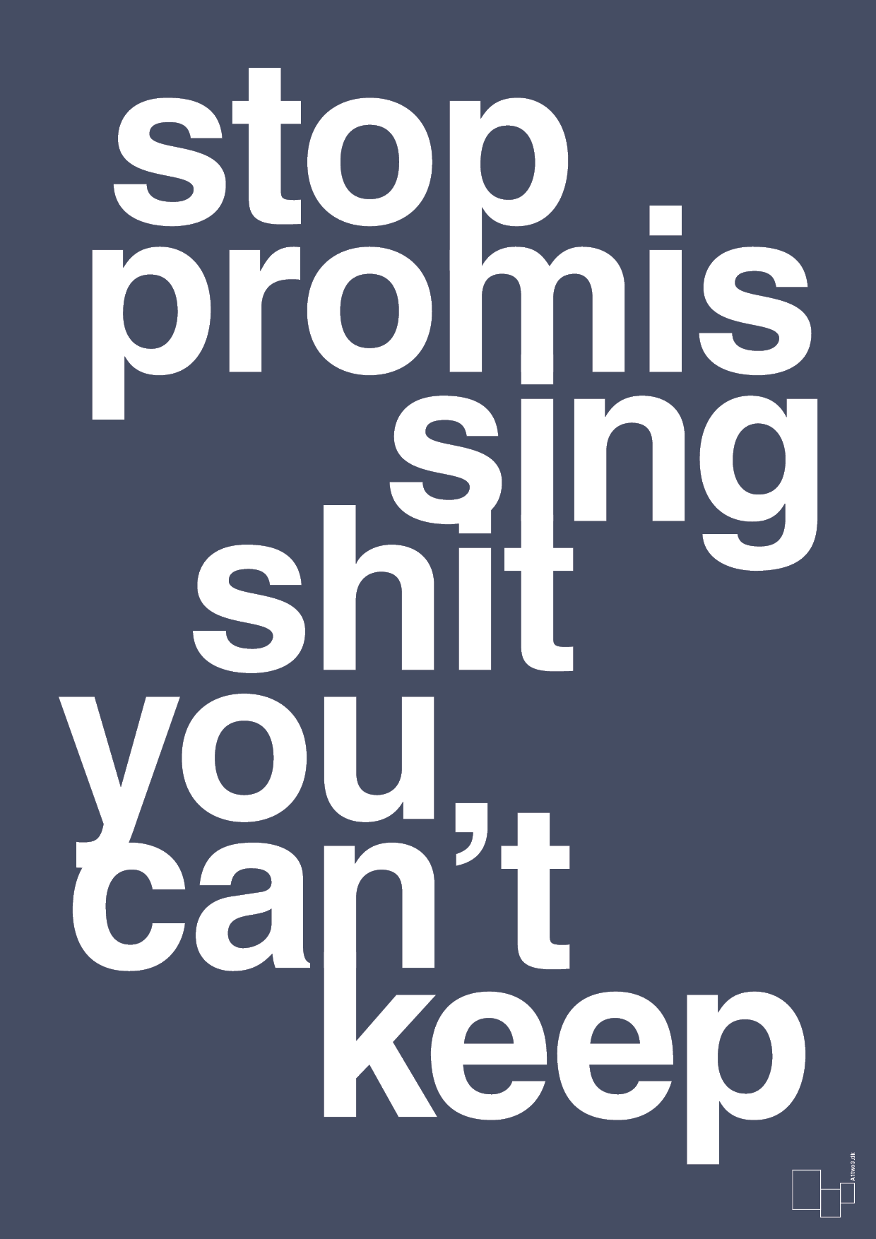 Denne typografiske plakat er til dig, der elsker et direkte budskab, skarpt grafisk design og en smule rå humor på væggen. Med teksten “stop promissing shit you can’t keep” bliver ingen i tvivl: her tager man ord, aftaler og integritet seriøst – men altid med et glimt i øjet.