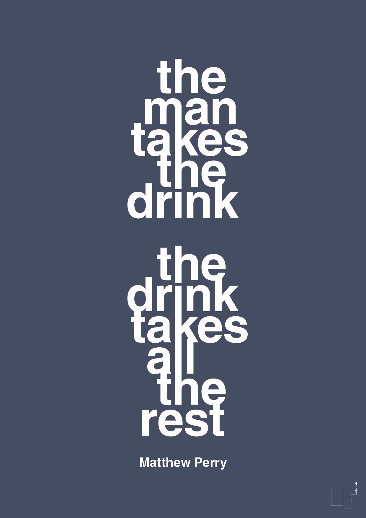Denne typografiske citatplakat samler et af de mest markante og eftertænksomme udsagn fra Matthew Perry i et skarpt, grafisk layout. Teksten “the man takes the drink – the drink takes all the rest” er sat med store, rene bogstaver, hvor ordene flettes vertikalt ind i hinanden og skaber en visuel spænding, der understreger budskabet om balancen mellem kontrol og tab.