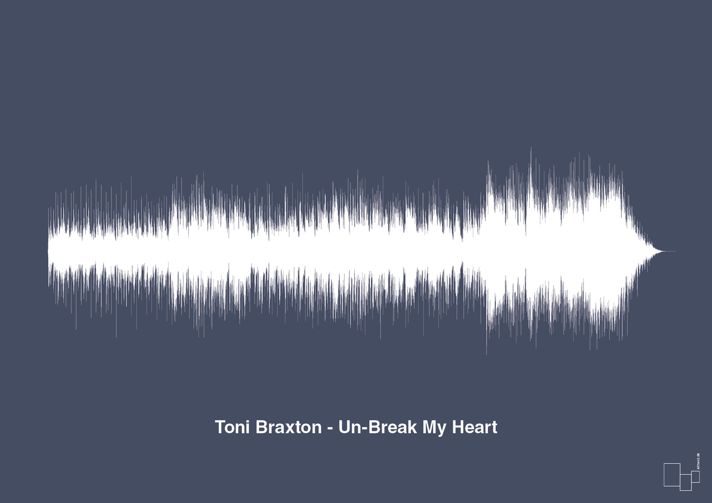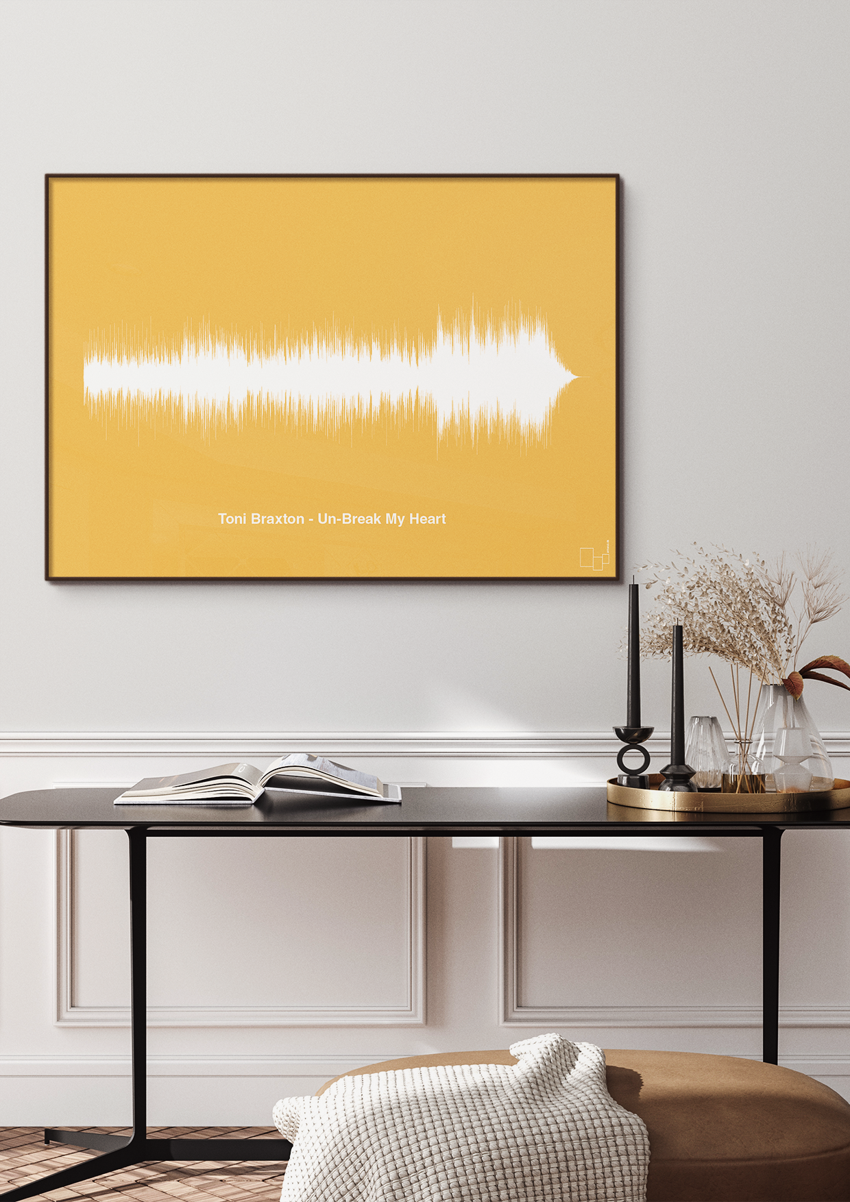 Denne stilrene musikplakat fortolker Toni Braxtons ikoniske ballade “Un-Break My Heart” som en grafisk lydbølge. Hele nummerets følelsesladede intensitet er omsat til et skarpt, horisontalt waveform-motiv, der løber tværs over plakaten og skaber et markant, moderne udtryk på væggen.
