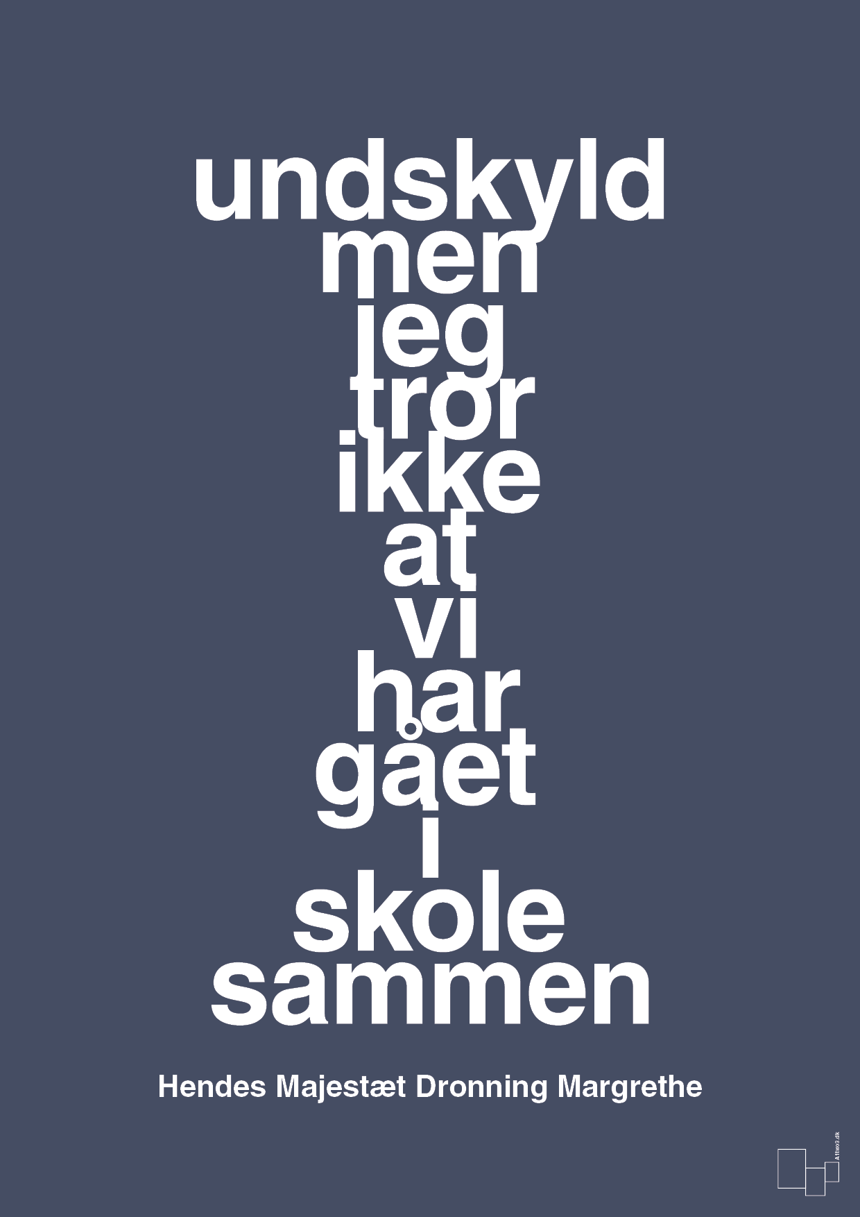 Denne typografiske plakat samler et af de mest ikoniske, skarpe og høfligt markante citater fra Hendes Majestæt Dronning Margrethe. Teksten “undskyld men jeg tror ikke at vi har gået i skole sammen” er sat i et rent, moderne layout, hvor ordene står i centrum og skaber en stærk, grafisk søjle midt på plakaten. Resultatet er et stilrent kunstprint, der både får dig til at smile og sender et kærligt vink om god tone og respekt.