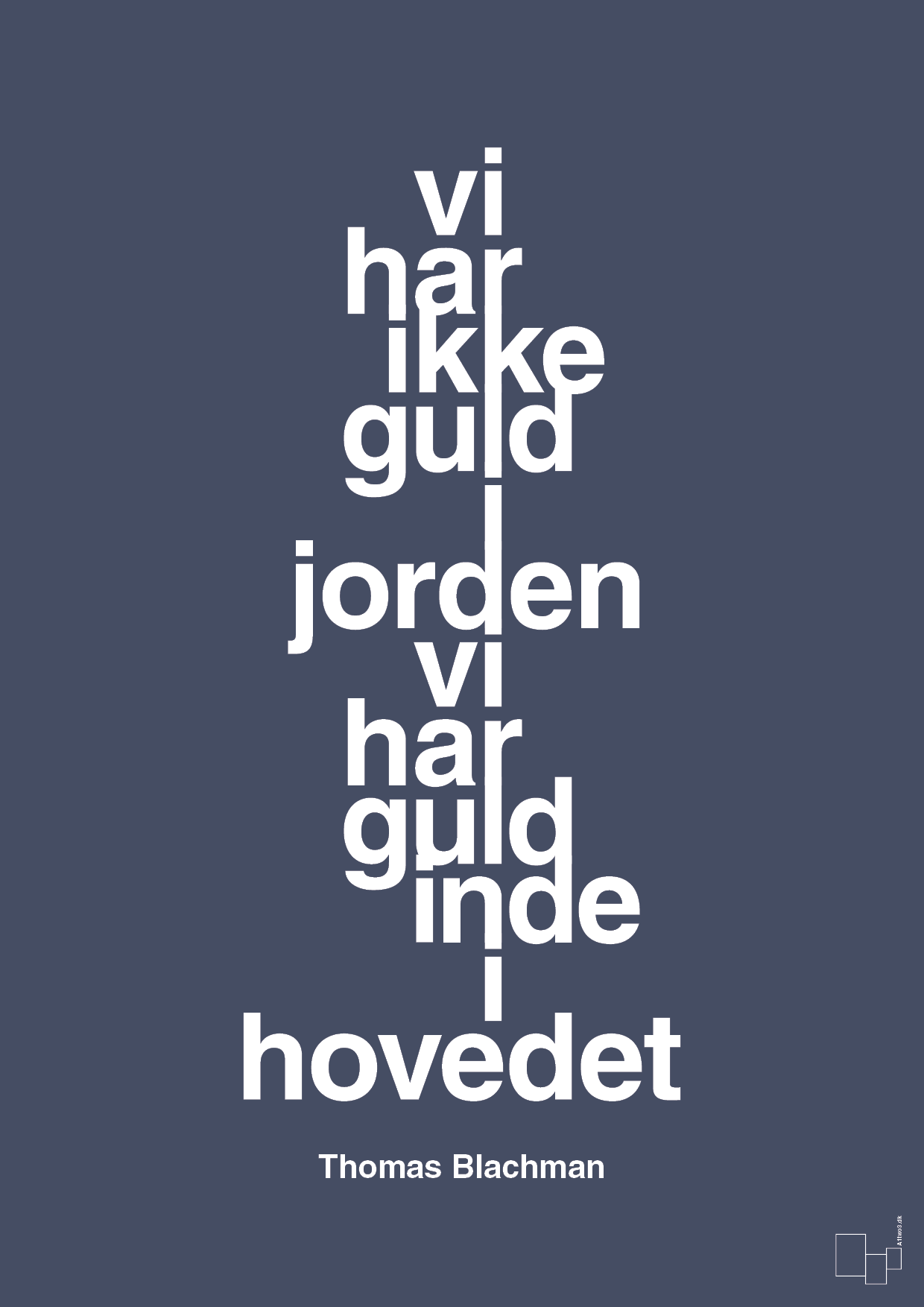 Denne grafiske citat plakat hylder den menneskelige kreativitet med ordene “vi har ikke guld i jorden, vi har guld inde i hovedet” af jazzmusikeren og X Factor-dommeren Thomas Blachman. Teksten er sat lodret og tæt, så ordene danner en kompakt, typografisk søjle midt på plakaten – et markant visuelt statement, der straks fanger blikket.