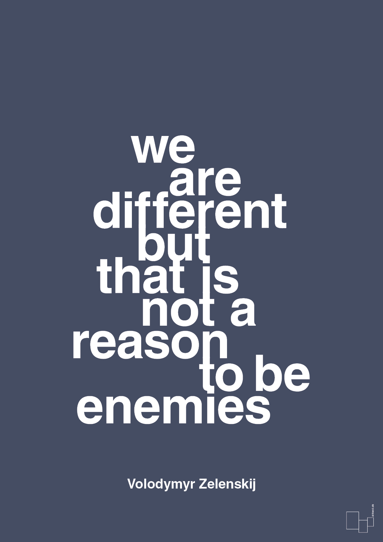 Denne typografiske citatplakat med teksten “we are different but that is not a reason to be enemies” er et stærkt, visuelt statement om respekt, mangfoldighed og fredelig sameksistens. Den enkle, stramme opsætning i store blokbogstaver gør budskabet umuligt at overse og giver rummet et moderne, grafisk udtryk.