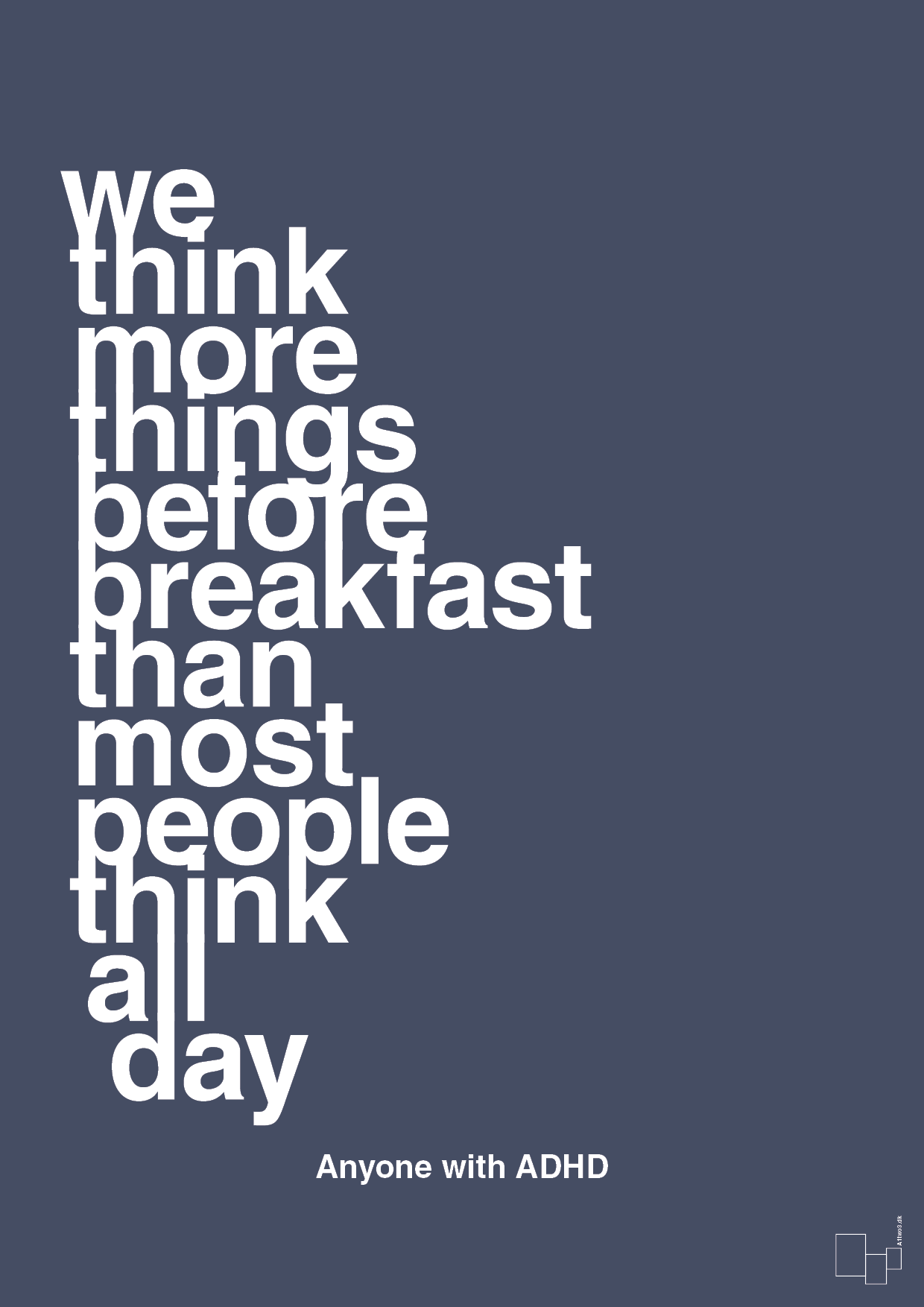 Denne typografiske ADHD plakat hylder den hurtige hjerne, de mange idéer og tankemylderet, der aldrig rigtigt holder fri. Teksten “we think more things before breakfast than most people think all day – anyone with ADHD” er sat op i en stram, grafisk komposition, der nærmest vælter ned over siden – præcis som tankerne kan gøre i hovedet.