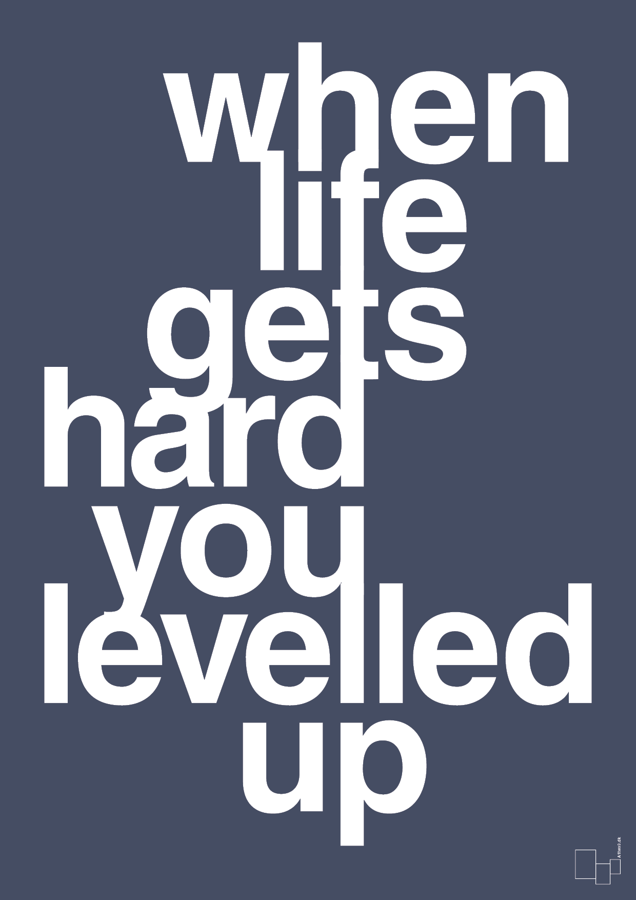 Denne typografiske gamer plakat er til dig, der elsker level ups – både i spil og i livet. Det store, markante citat “when life gets hard you levelled up” fylder hele fladen i et stramt, grafisk layout, der giver følelsen af fokus, momentum og next level motivation.