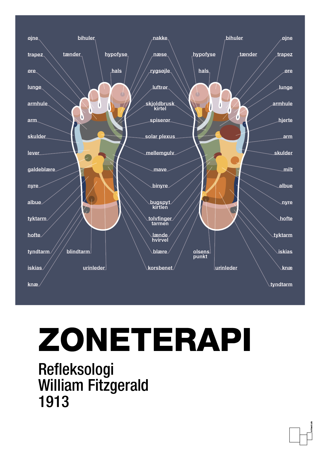 Denne zoneterapi plakat fra A1two3 forener professionel refleksologi med enkelt, skandinavisk design. De to fødder er illustreret i et klart, grafisk udtryk, hvor hvert område på fodsålen er markeret og navngivet med tilhørende organ eller kropsdel – fra øjne, bihuler og rygsøjle til lever, mave, tarme og nyrer. Plakaten giver et hurtigt, visuelt overblik over zoneterapiens vigtigste reflekszoner og rødder i William Fitzgeralds arbejde fra 1913.
